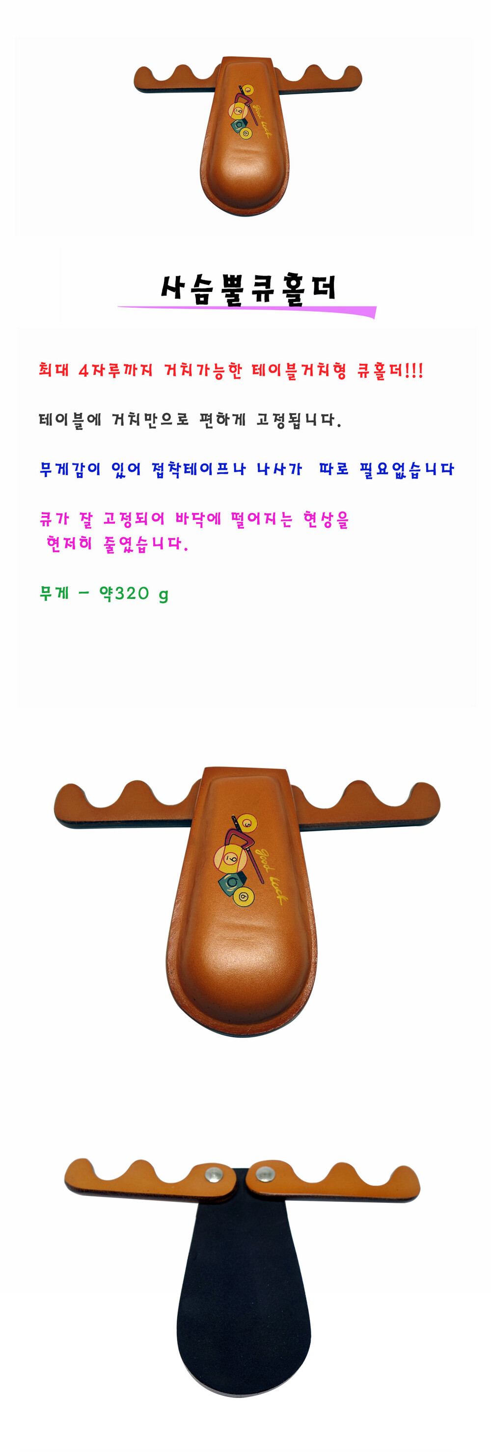 - 당구 큐 구매 후 단순 변심의 경우에는 3일 이내까지 교환∙반품이 가능하나, 쵸크칠등 사용시 반품이 불가합니다.